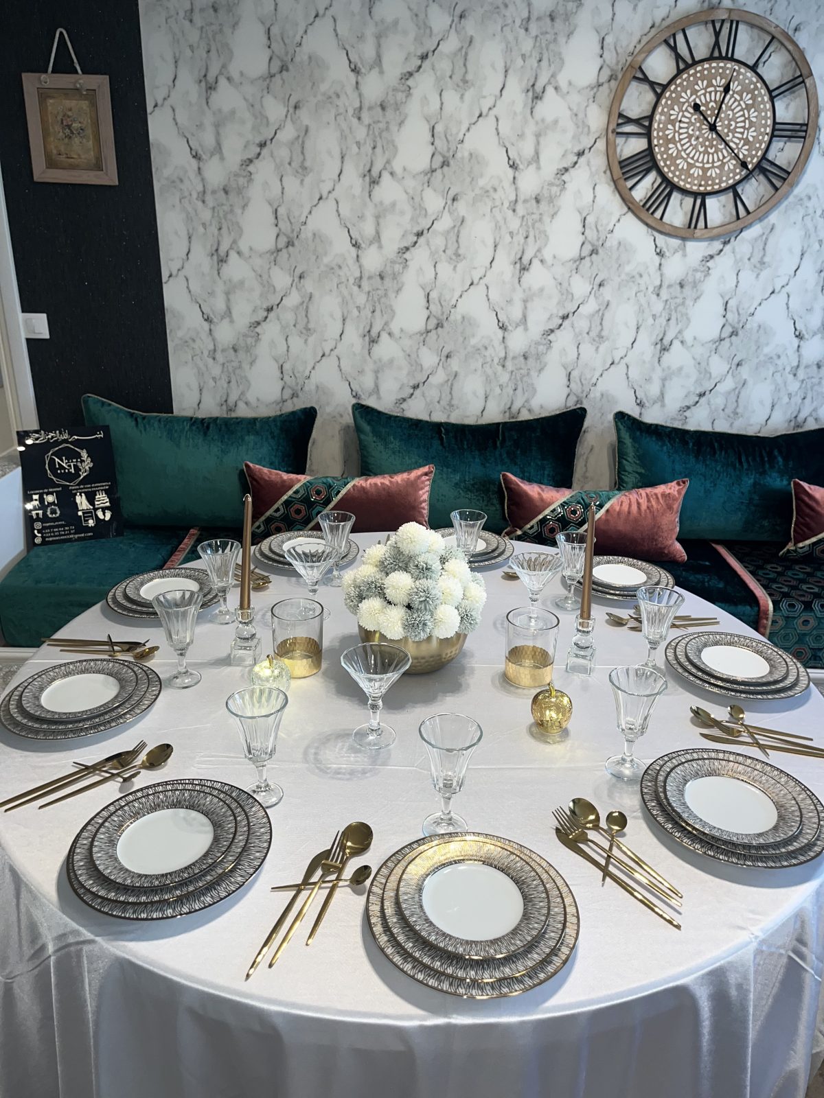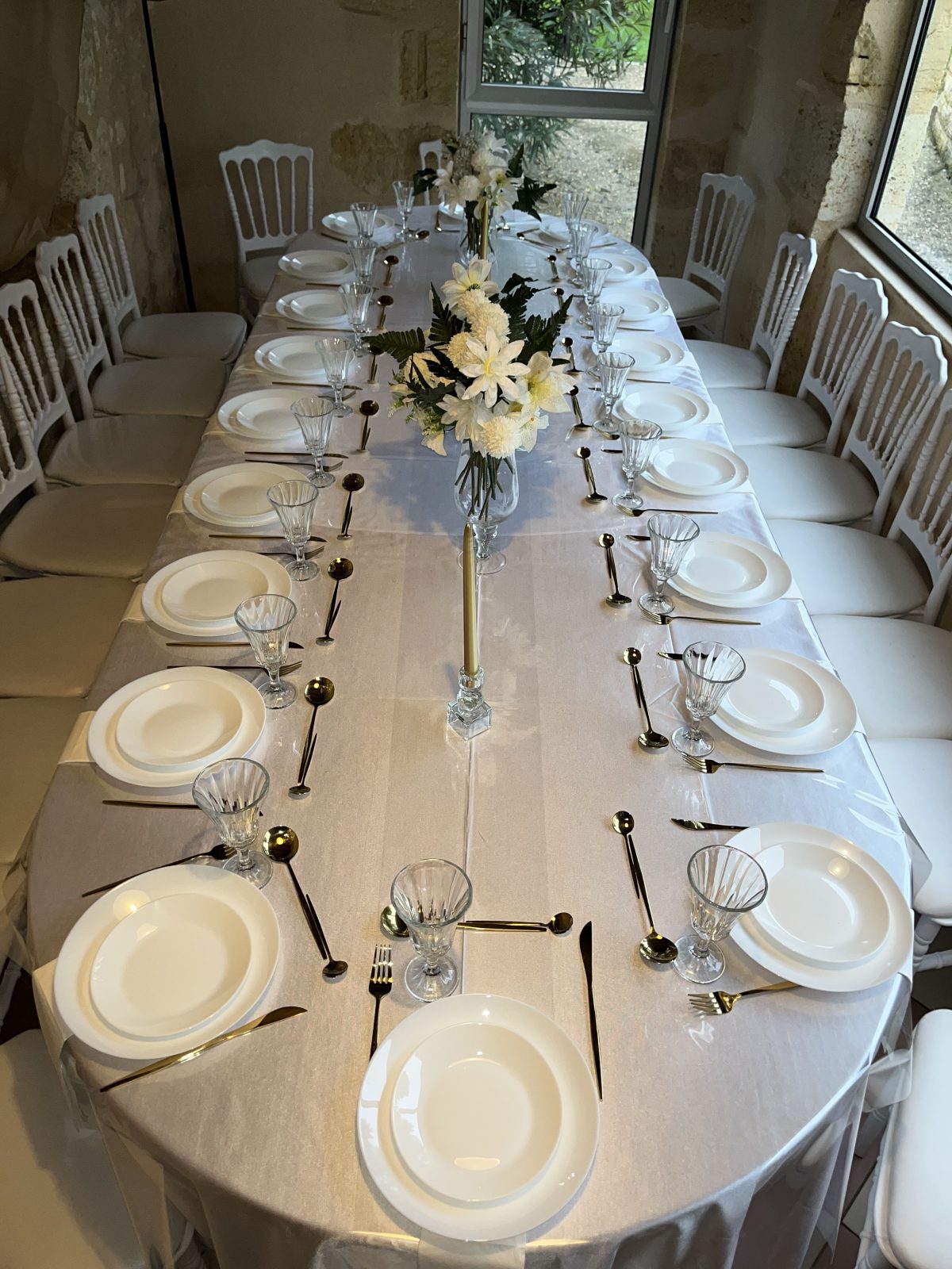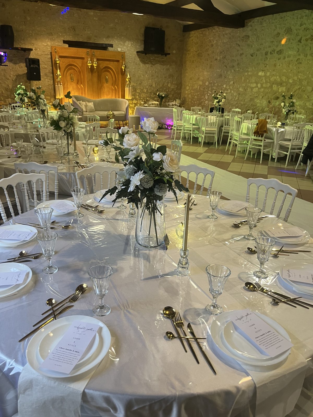 Décoration de table : Vaisselle élégante, centres de table raffinés, bougies, nappages et chemins de table assortis.
