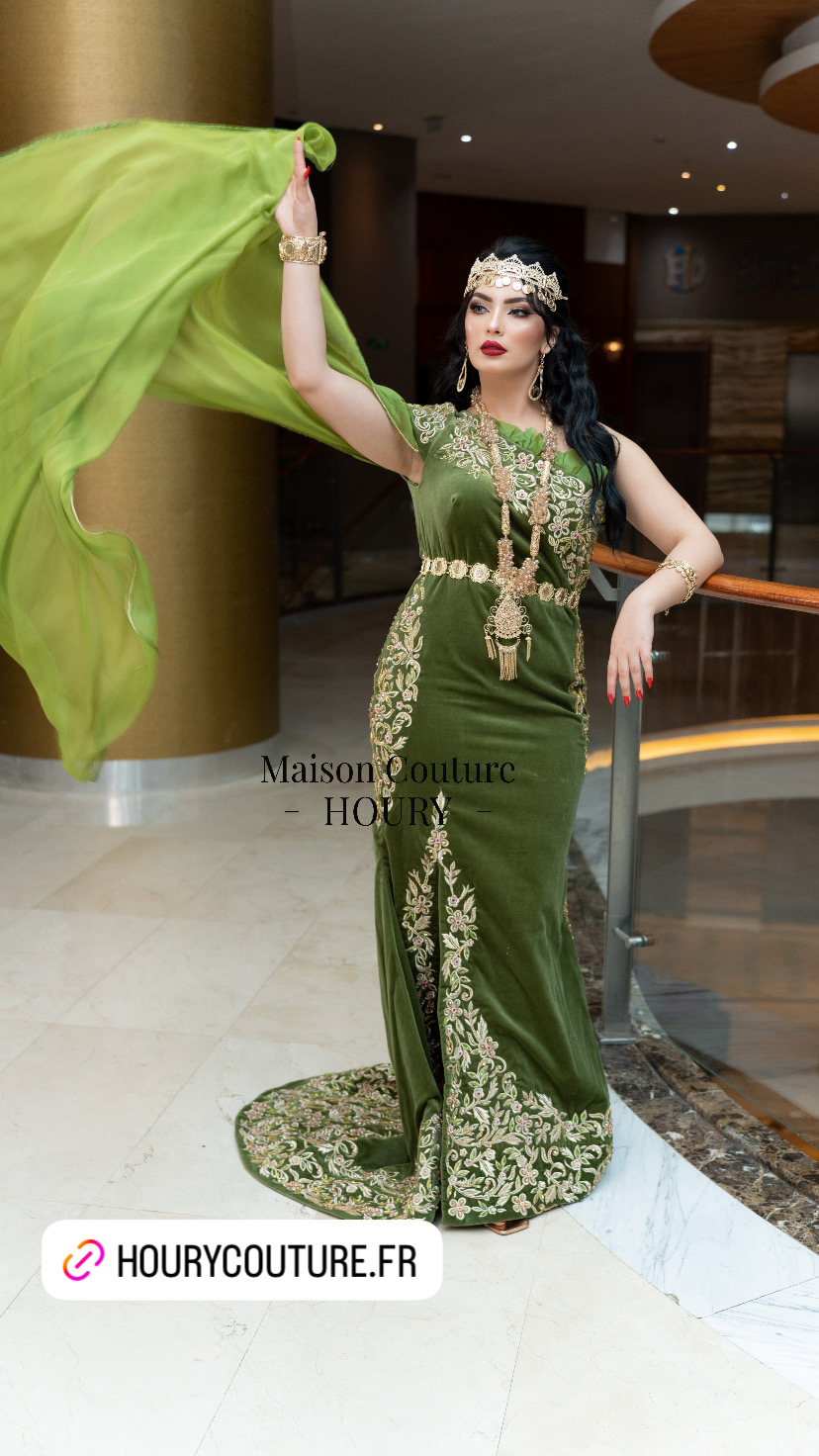 Fergani sirène vert olive, entièrement brodé à la main et orné de cristaux pour une touche de lumière subtile. Sa coupe met la silhouette en valeur, tandis que ses longues manches en organza apportent finesse et élégance.