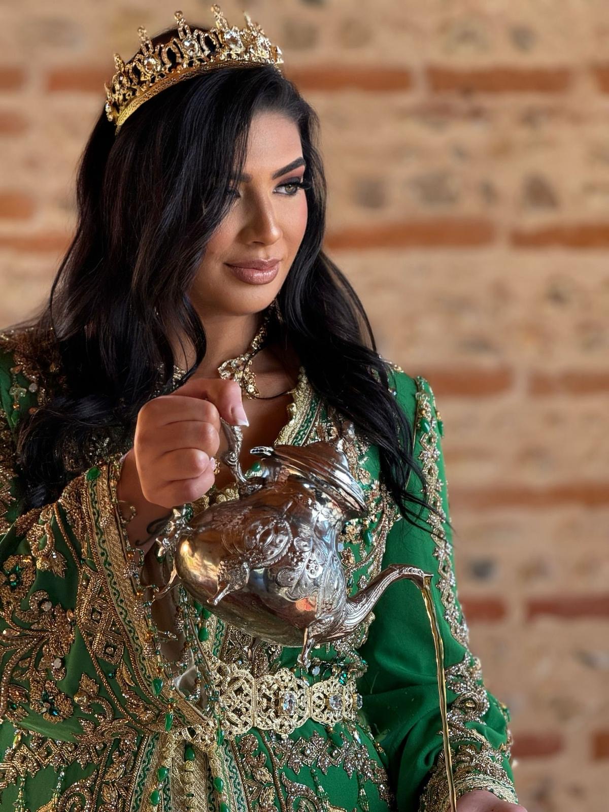 Choix des robes , accessoires et tenue homme assorti , trône, décoration arrière, assise henné complète avec tenue offerte,drapeaux , tapis royal, suivi en salle pour toute la soirée et retouche maquillage.